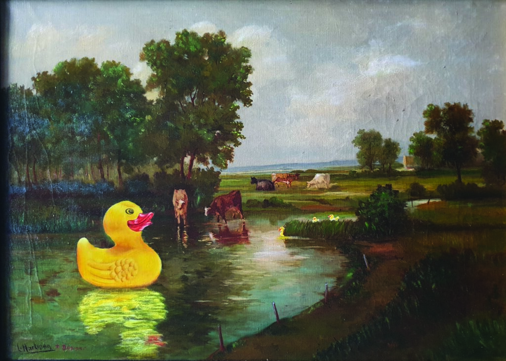 Burlesque on Canvas Inspired by Jheronimus Bosch ca 1489 St. John op Patmos. Een bedacht verhaal, belachelijk, wonderlijk, grappig, vermakelijk. Een burleske is een kluchtig gedicht of blijspel. Meestal wordt een hoogdravend onderwerp (met goden, helden, geliefden) in zeer platte taal behandeld. Het Italiaanse burlesco is een afleiding van burla‘: klucht, grap. De schrijver maakt in de burleske overdadig gebruik van karikaturale overdrijving: de discrepantie tussen het onderwerp en de stijl primeert. De lezer of toeschouwer ervaart naar gelang van zijn eigen moreel referentiekader een burleske als een schaamteloze beschrijving van een werkelijkheid die hij verafschuwt of omarmt. Jheronimus Bosch trok meer dan 500 jaar geleden al veel publiek en dit jaar in het bijzonder. Zijn schilderij, de heilige Johannes op Pathmos is hier op mijn manier geïnterpreteerd; ter vermaak! Zonder diepzinnige betekenis, juist omdat kunst vaak zo beladen is doordat gedachten die de kunstenaar zou kunnen hebben gehad tijdens het schilderen door experts worden gezocht, geïnterpreteerd en geanaliseerd. In mijn schilderij heeft de in de 30er jaren bekende Burlesquedanseres Lily St. Cyr de plek van de heilige Johannes ingenomen. Zij leest geen boek maar toont haar schoonheid. Een roodborstje zit op haar hand. De skyline van het schilderij van Jeroen Bosch is veranderd in die van Kleef, mijn huidige woonplaats. De raaf is vervangen door een zwarte zwaan. De (weliswaar witte) zwaan is toevallig het symbool van de stad Kleef. Tijdens het onstaan van het schilderij overleed David Bowie. Net als in zijn laatste song “Look up Here, I am in Heaven”, is hij door mij als Lazerus vereeuwigd in de linker bovenhoek. Ik had vier dagen de hoop dat hij weer zal herrijzen. 😉 Wie zich nu nog graag het hoofd wil breken over de betekenis van de zwaan, het roodborstje, de narcis, het tepelkwastje of wat dan ook in het schilderij, veel plezier! Maar vooral met het schilderij!